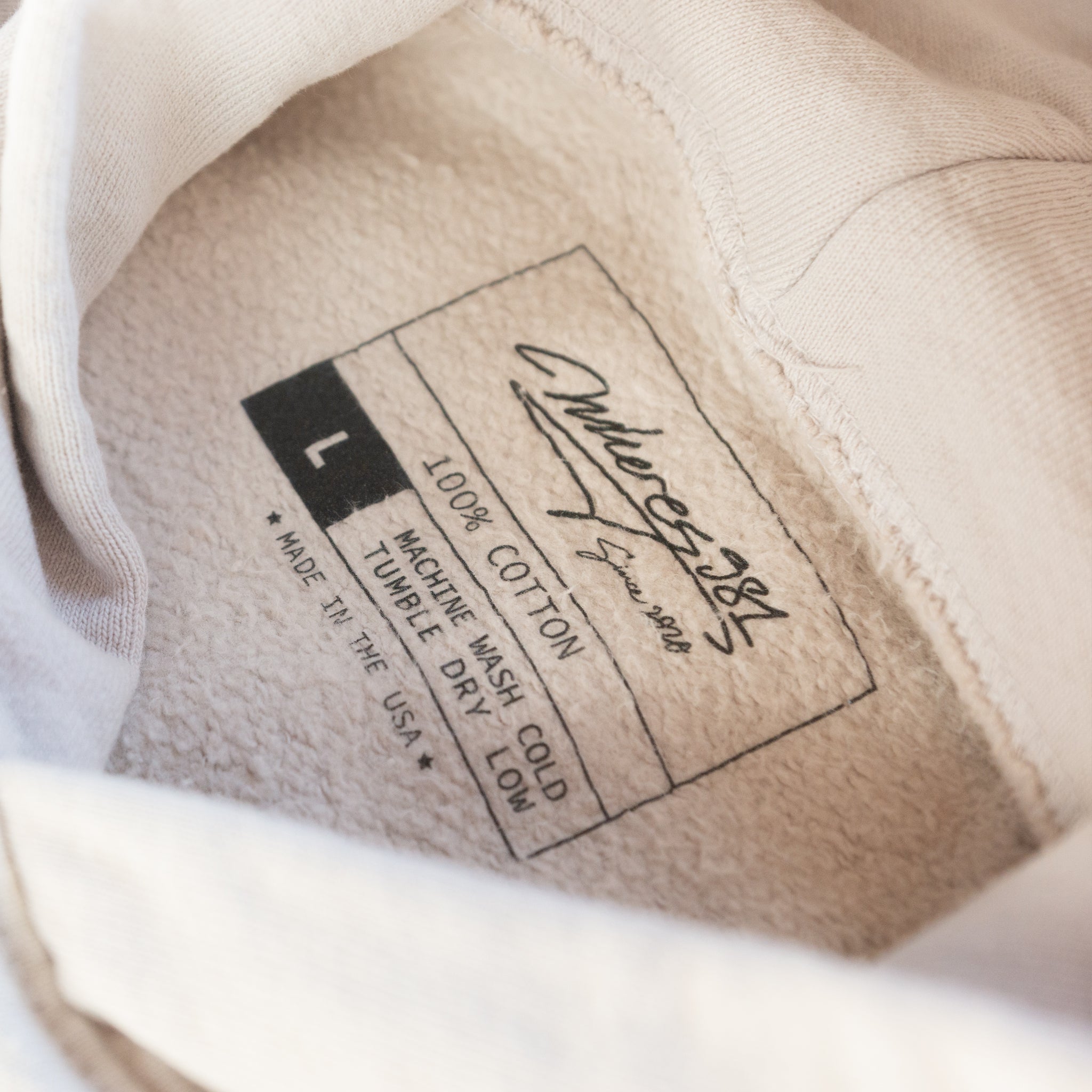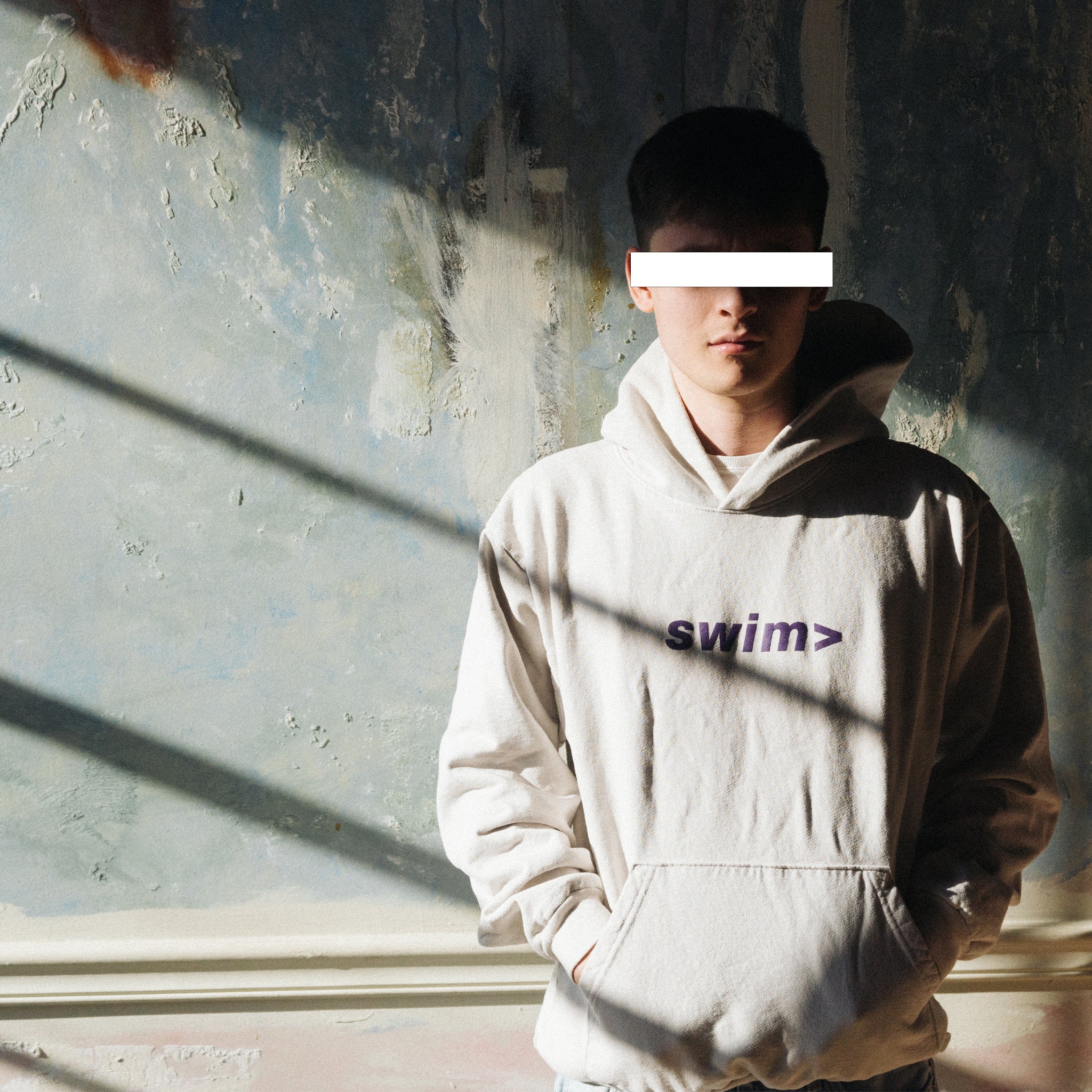 classic swim> logo (purple) puff printed onto a white smoke dyed hoodie