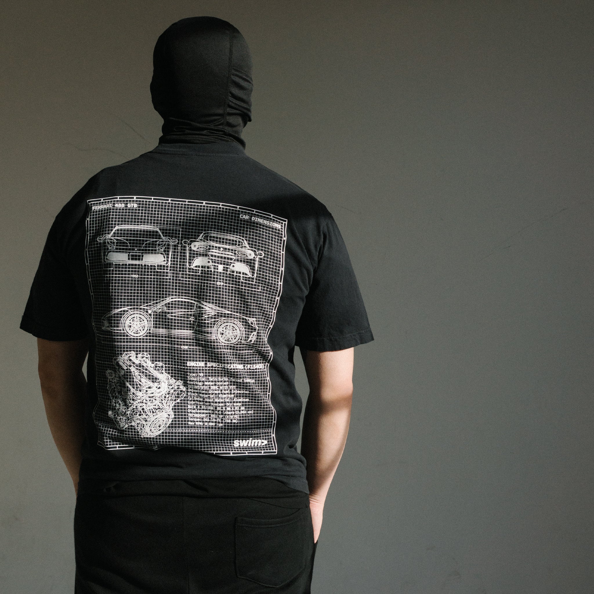 Back features a Ferrari 488 GTB blueprint screen-printed onto the back