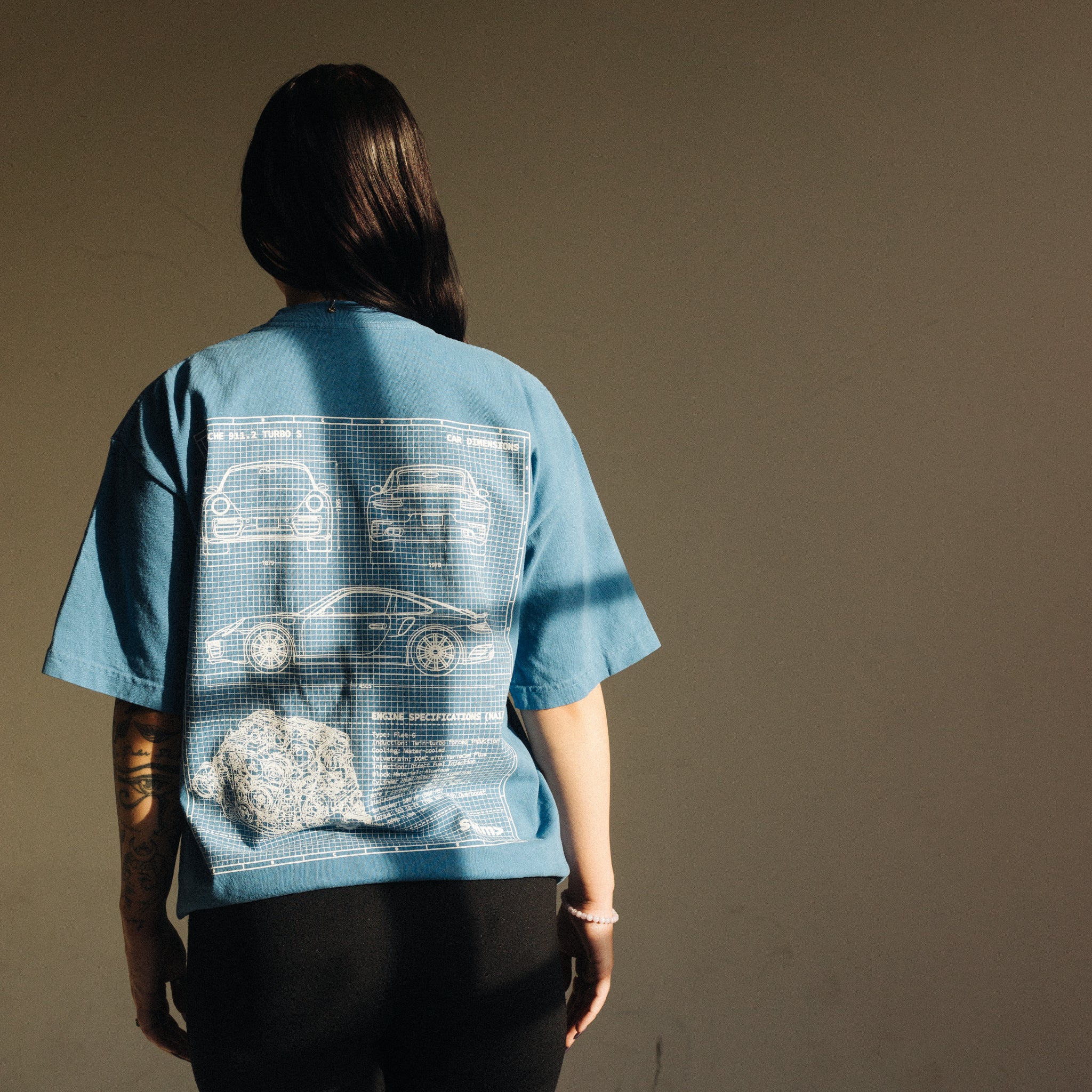 Back features a Porsche 991 Turbo S blueprint screen-printed onto the back